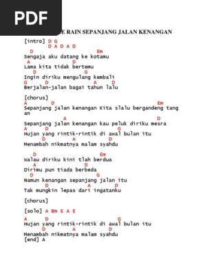 The Rain Sepanjang Jalan Kenangan Intro A. D G Gm D A D A D Em Sengaja aku datang ke kotamu A D Lama nian tidak bertemu D7 G Gm Ingin diriku mengulang kembali D A D A Berjalan-jalan bagai tahun lalu REFF. Lirik dan Chord Lagu Sepanjang Jalan Kenangan - Tetty Kadi.