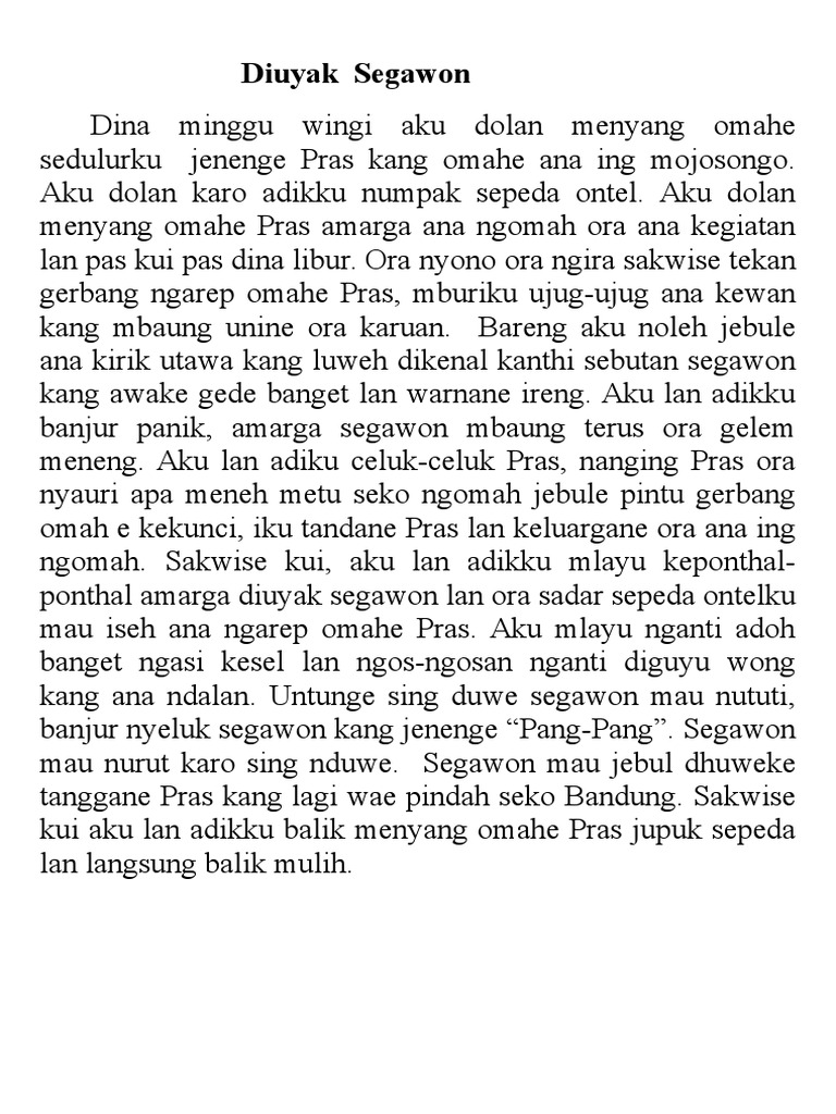 Cerita Pendek Bahasa Jawa Hewan - Hello friends zilacygworld In the article that you read this time with the title Cerita Pendek Bahasa Jawa Hewan we have prepared this article well for you to read and retrieve information in it. Dongeng Bahasa Jawa - Seiring dengan perkembangan teknologi kegiatan mendongeng untuk anak banyak ditinggalkan orang tua. Kumpulan Contoh Cerita Fabel Singkat dan Panjang.